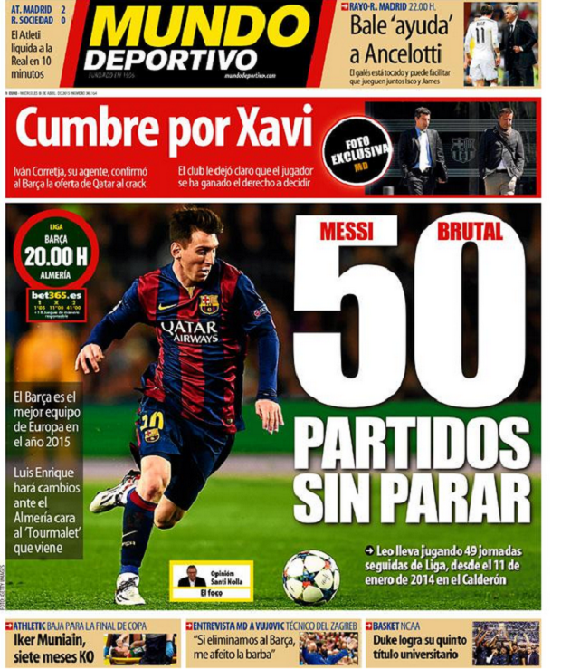 Messi Brutal. É dessa forma que o jornal catalão "Mundo Deportivo" celebra a sequência de 50 jogos seguidos do argentino no Campeonato Espanhol. A série começou começou no empate com o Atlético de Madrid, ainda na temporada passada, no dia 11 de janeiro de 2014 (a última vez em que desfalcou a equipe foi na vitória sobre o Elche, em 5 de janeiro de 2014).